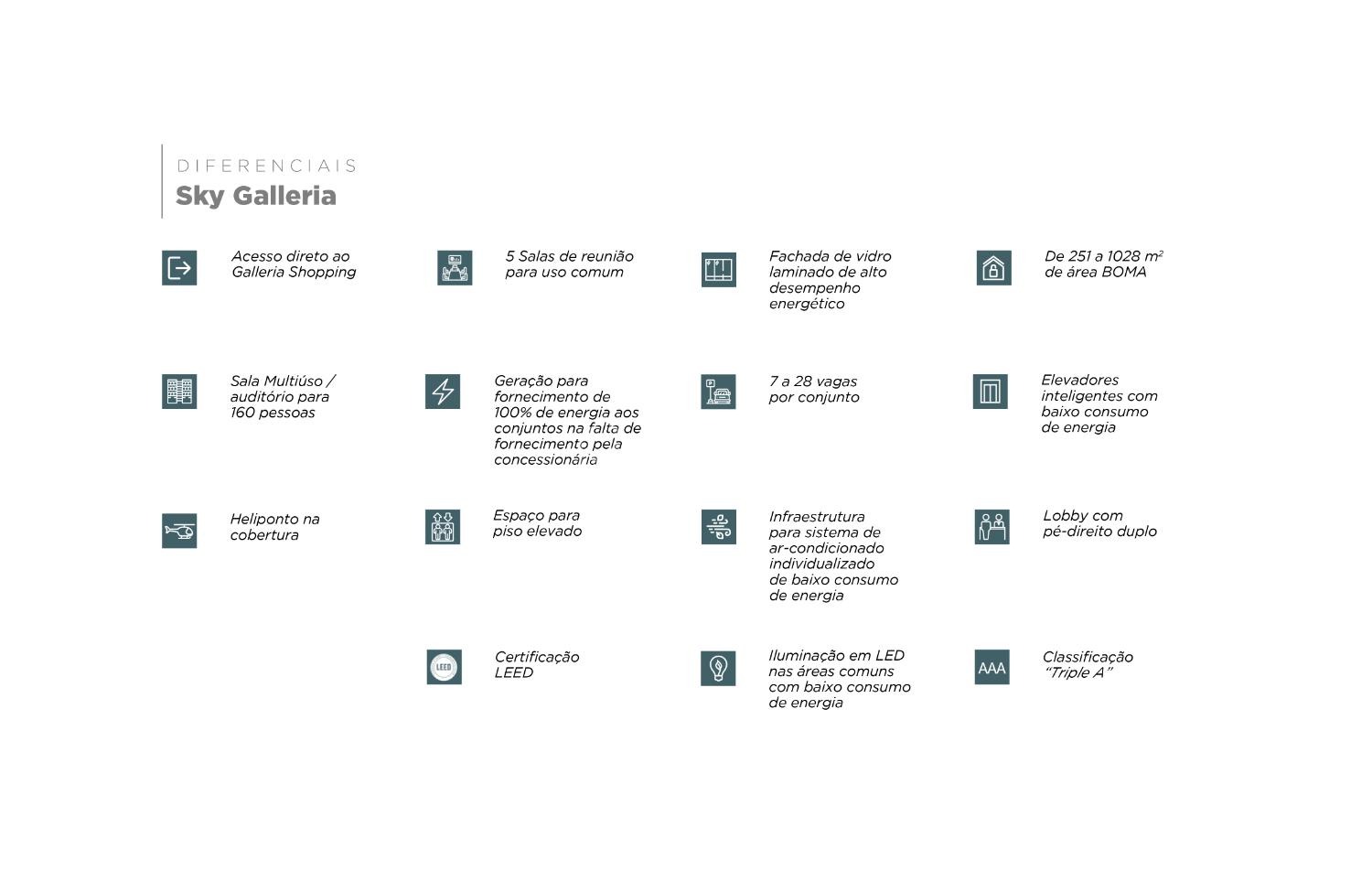 O Sky Galleria, torre corporativa de 18 pavimentos com conceito Triple A, estará inserida no Galleria Shopping, (pertencente ao Grupo Iguatemi), que além de ser uma das regiões de maior prestígio da cidade, é um polo consolidado com altas taxas de ocupação e forte crescimento imobiliário. O empreendimento contará com a certificação LEED (Leadership in Energy and Environmental Design), que é uma certificação para construções sustentáveis.