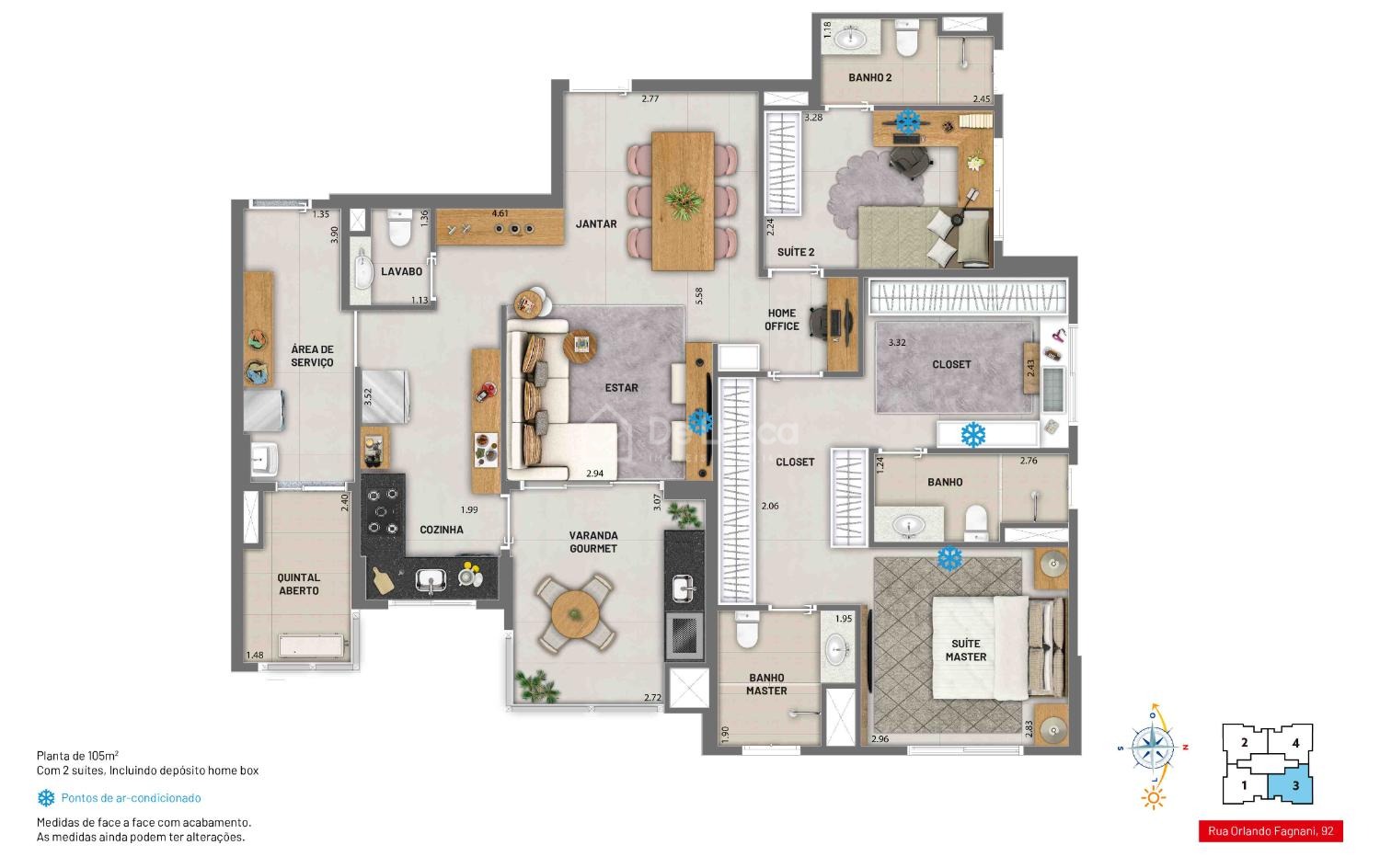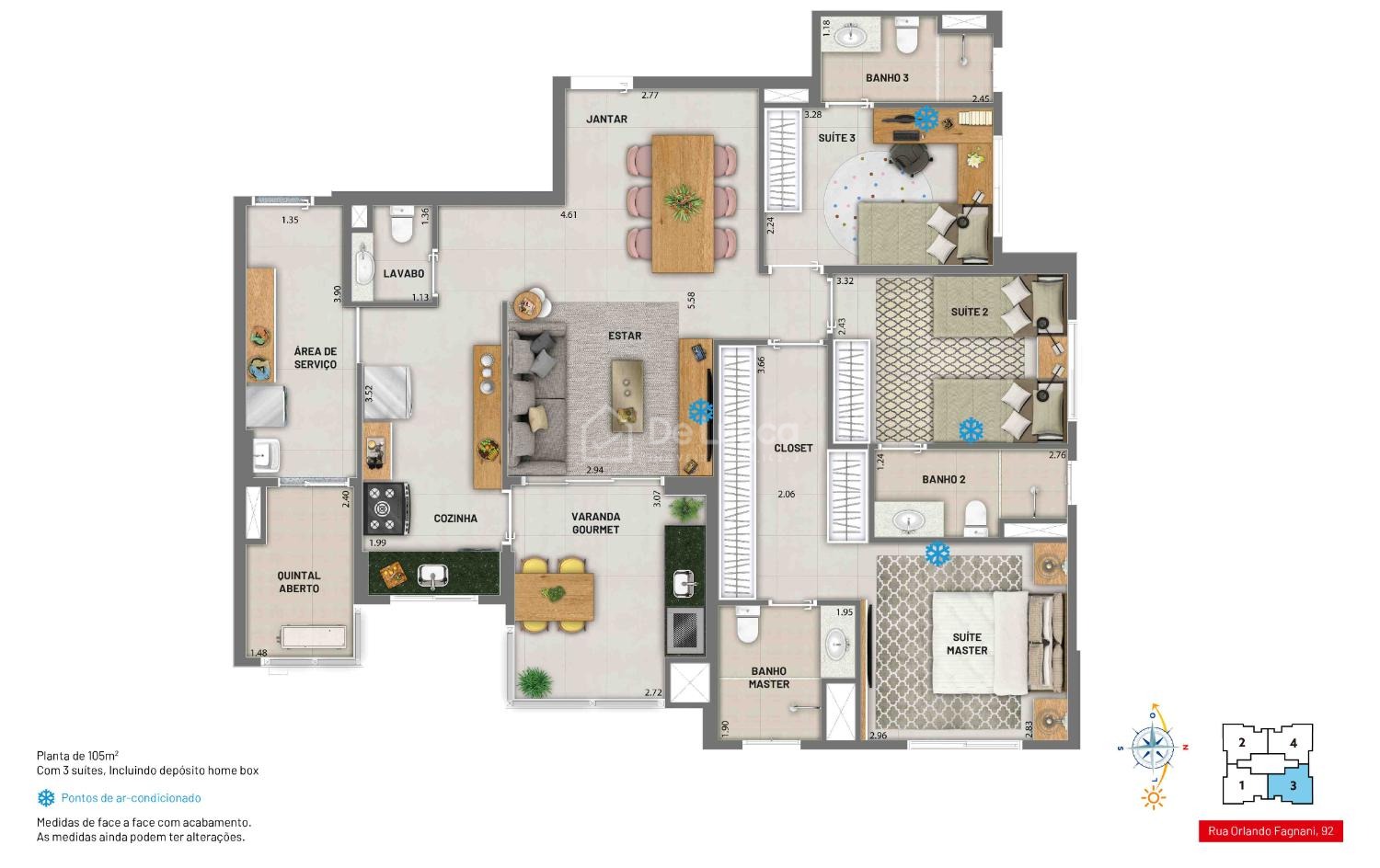 São 105 m² totais com vistas para ambos os bairros: Nova Campinas ou Cambuí, você escolhe! Esta unidade possui 102,56 m² e área privativa, contempla 03 suítes muito confortáveis e varanda gourmet integrada com a sala e a cozinha.