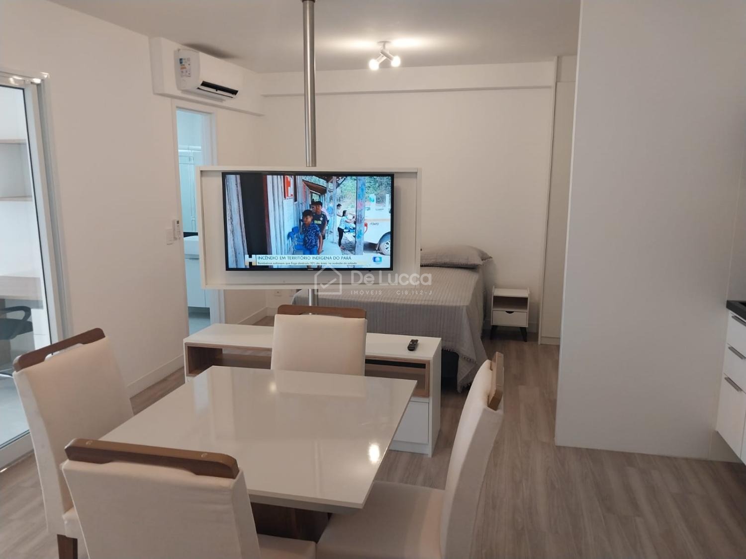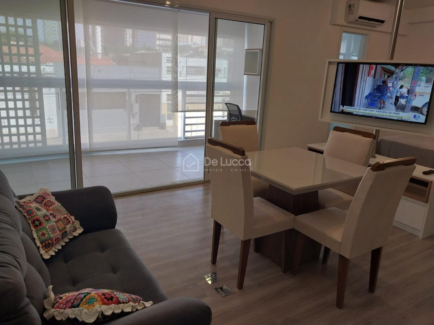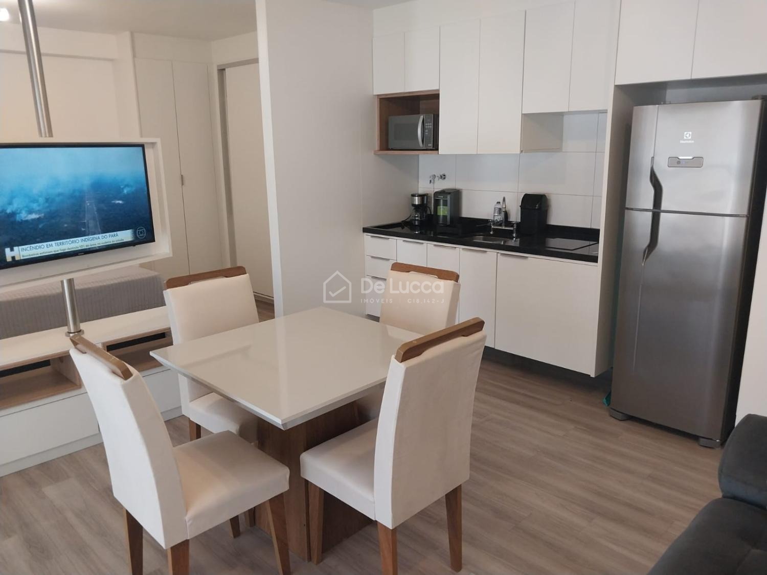 Mobiliado: O apartamento já vem mobiliado, incluindo cooktop, geladeira, cama box, sofá de 2 lugares, mesa com 4 cadeiras, painel para TV e armários na cozinha, banheiro e quarto. Isso significa que você não precisa se preocupar em comprar móveis e pode se mudar imediatamente. Agende já uma visita e venha morar aqui! Delucca Imóveis.