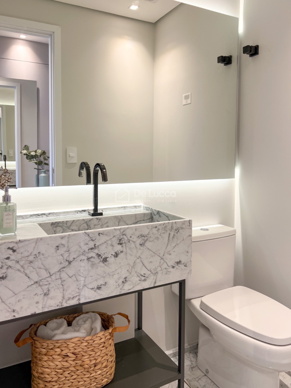 O lavabo, com sua atenção meticulosa aos detalhes, é um testemunho da dedicação à qualidade em cada canto desta residência.
