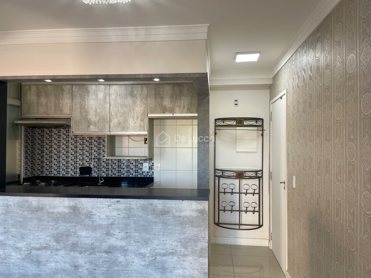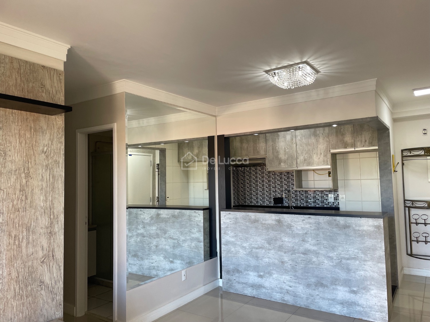 A cozinha americana é moderna e funcional, equipada com cooktop e forno, além de armários planejados. O apartamento possui ainda lavanderia, espelhos e iluminação planejada, que valorizam ainda mais os ambientes.