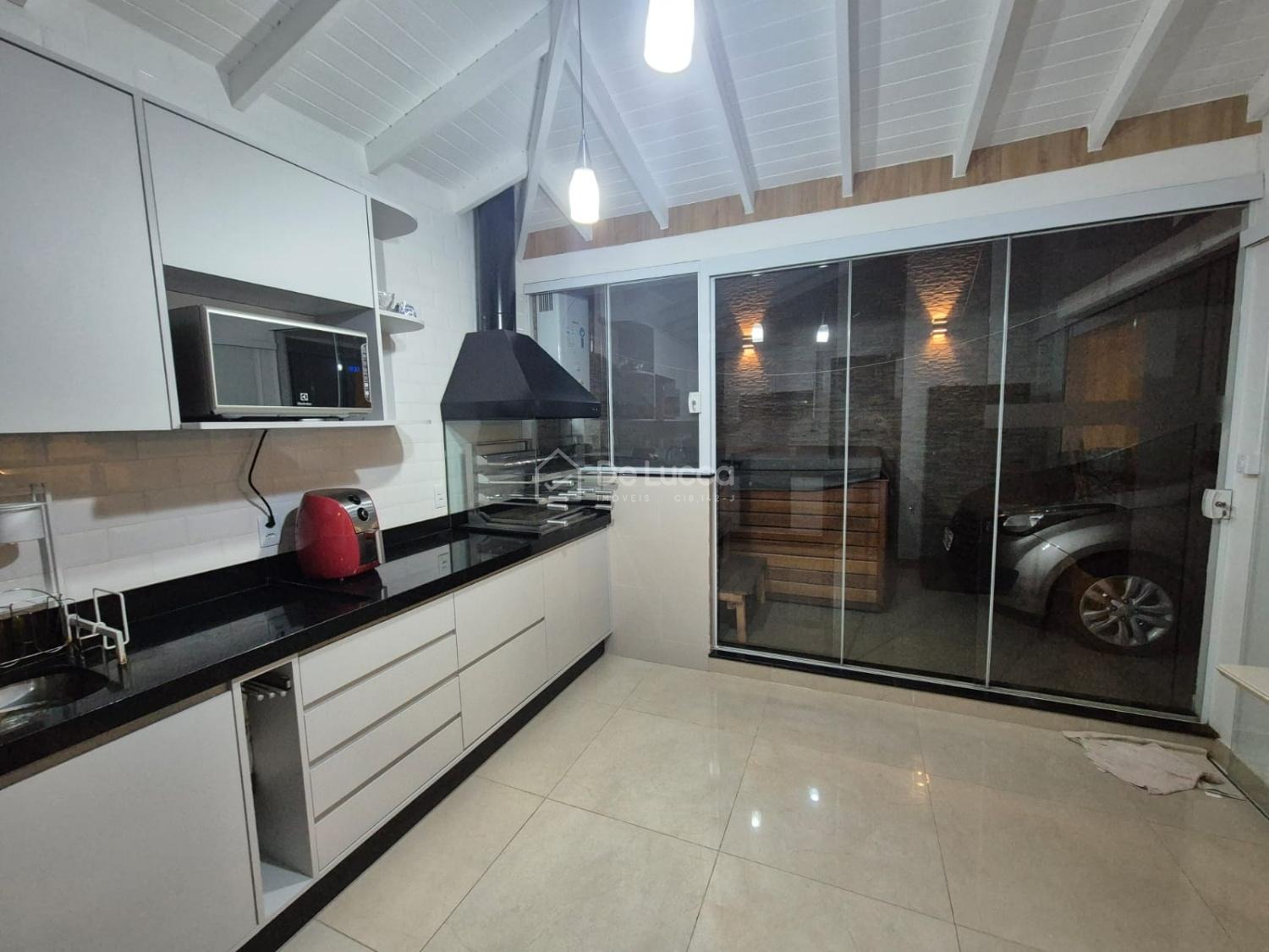 A casa conta com 3 dormitórios, sendo 1 suíte espaçosa, todos com ar-condicionado instalado e armários planejados. A sala ampla comporta até 3 ambientes, perfeita para momentos de convívio e recepção de convidados. O ambiente de convivência se estende para a cozinha integrada à área gourmet, equipada com churrasqueira a carvão, cooktop, exaustor, forno a gás e armários planejados.