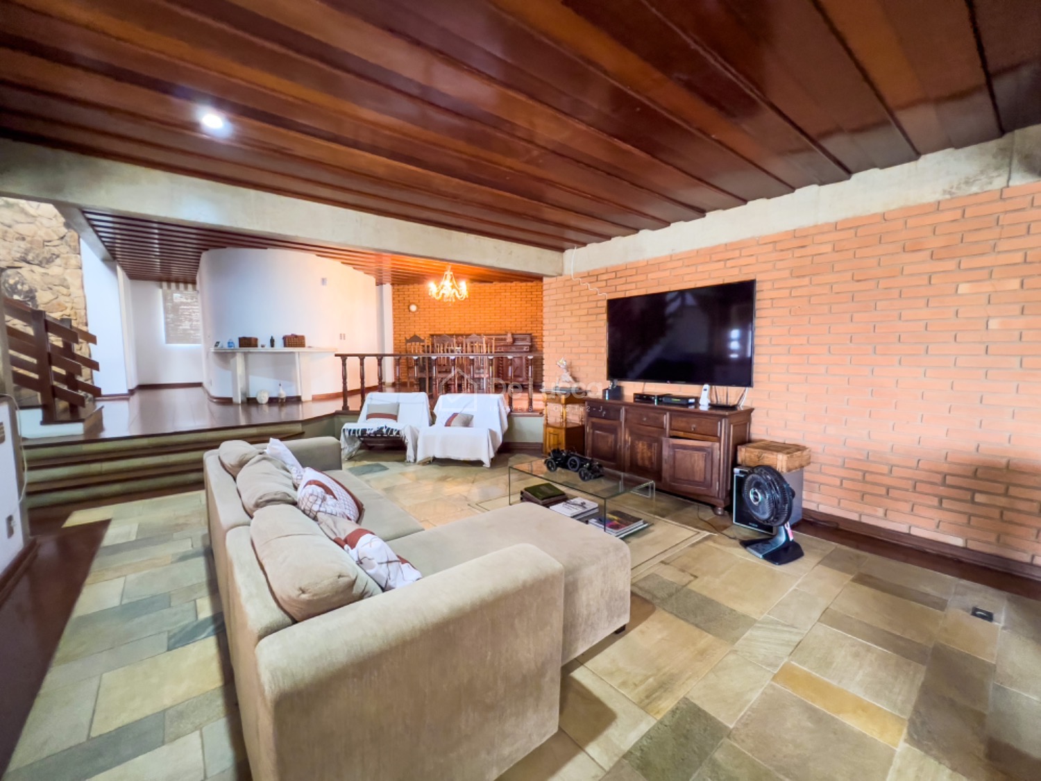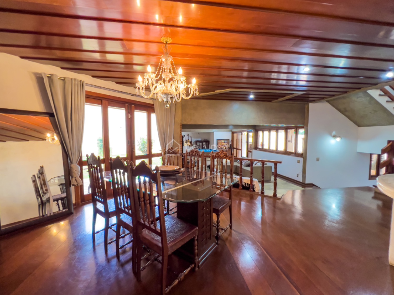 No térreo, o imóvel conta com living aconchegante para estar, sala de jantar, ampla sala de TV integrada ao espaço gourmet com piscina e sauna, além de sala de almoço e escritório planejado.