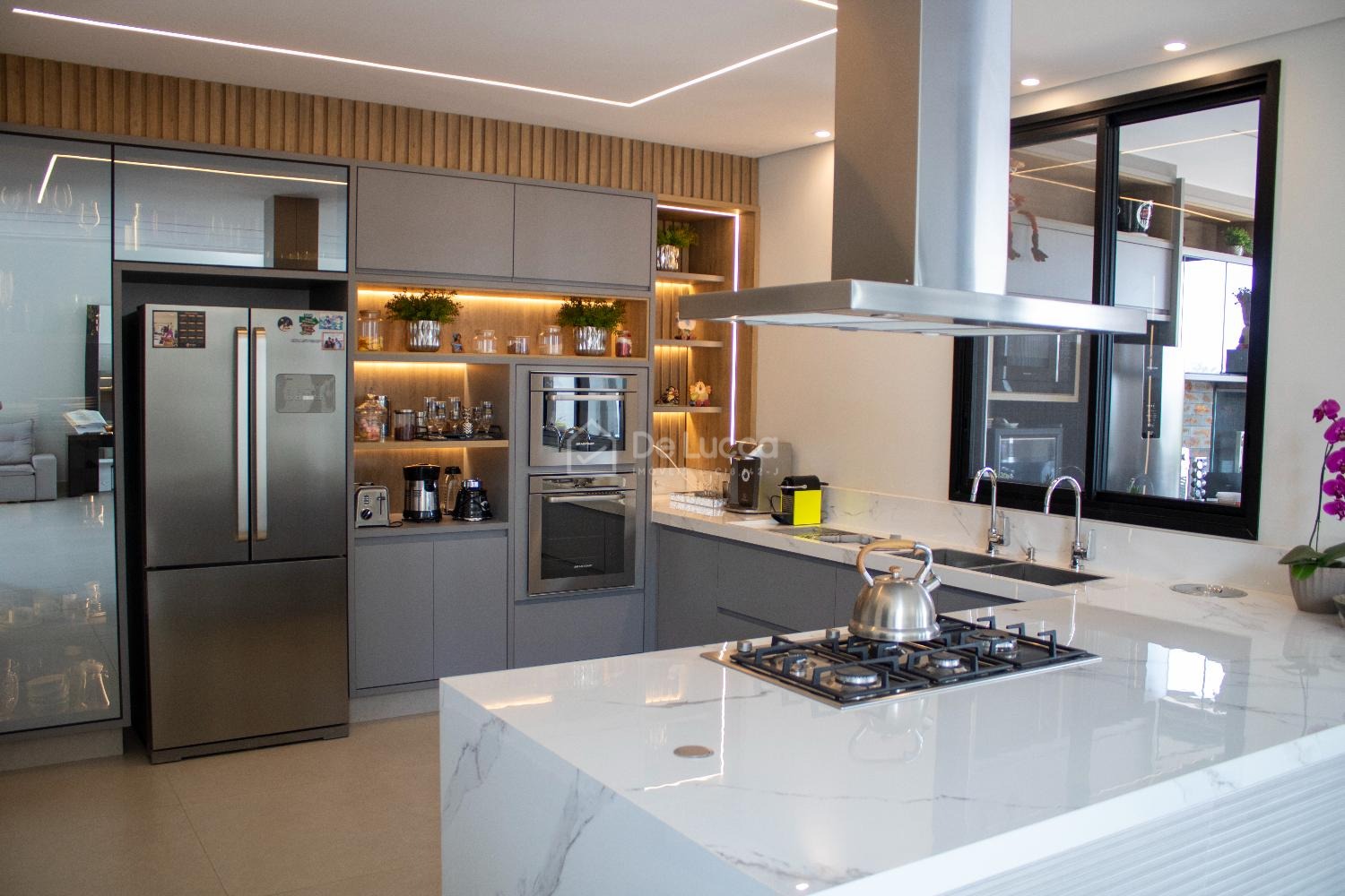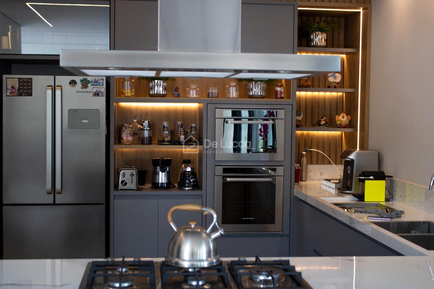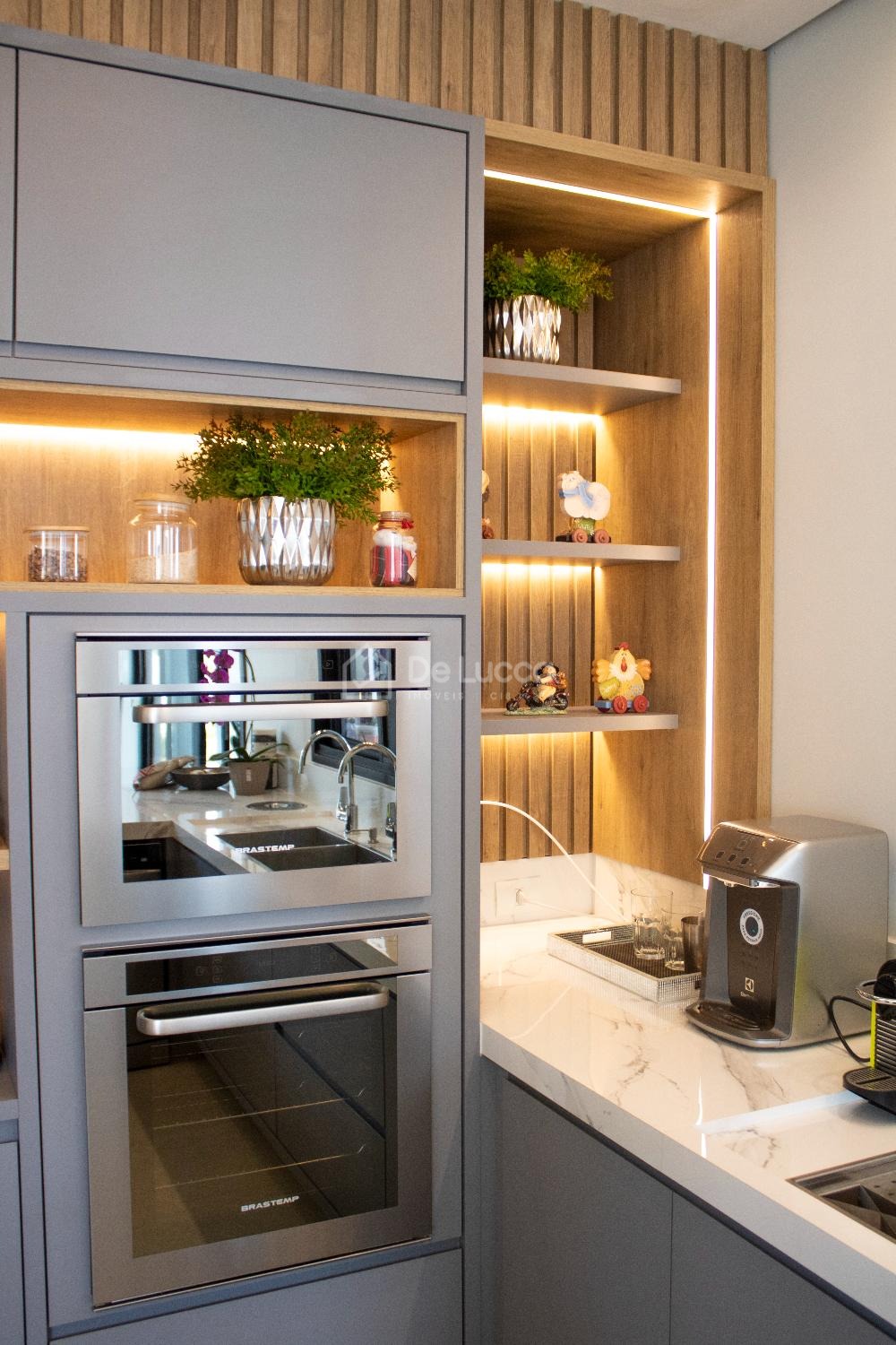A cozinha americana planejada é um verdadeiro espetáculo, pensada para quem aprecia funcionalidade e estilo. Equipado com cooktop, exaustor silencioso, forno de última geração e micro-ondas Brastemp, esse espaço é perfeito para criar pratos gourmet ou simplesmente preparar refeições para a família. Os armários planejados e a área de serviço bem organizada garantem que a casa se mantenha sempre impecável e sem esforço.