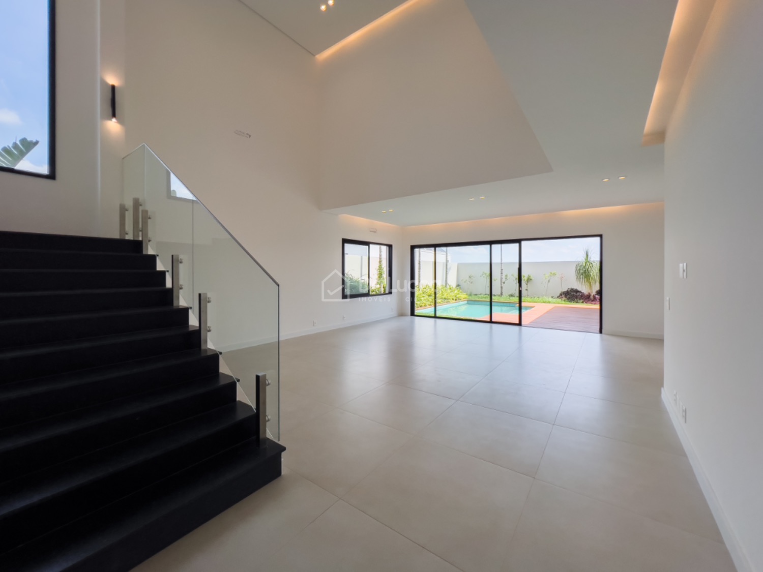 A casa foi projetada com atenção aos detalhes e distribuição funcional dos ambientes. No pavimento térreo, o imóvel conta com escritório reversível em dormitório, lavabo, hall de entrada, salas de estar e jantar integradas à cozinha planejada, além de espaço gourmet com lavabo, piscina com deck, despensa, lavanderia, quarto e banheiro de serviço, área de serviço, garagem e depósito. No pavimento superior, são quatro suítes, incluindo uma suíte máster com closet e varanda, além do hall de distribuição entre os quartos.