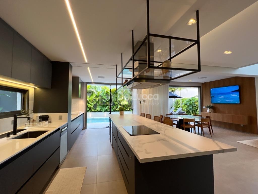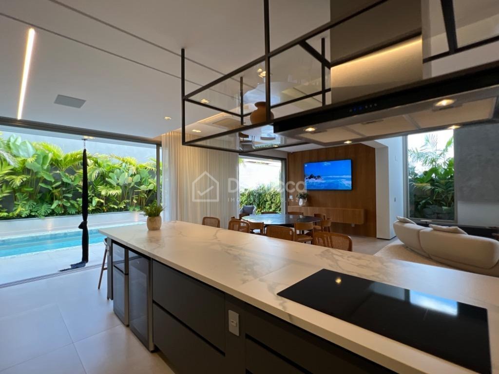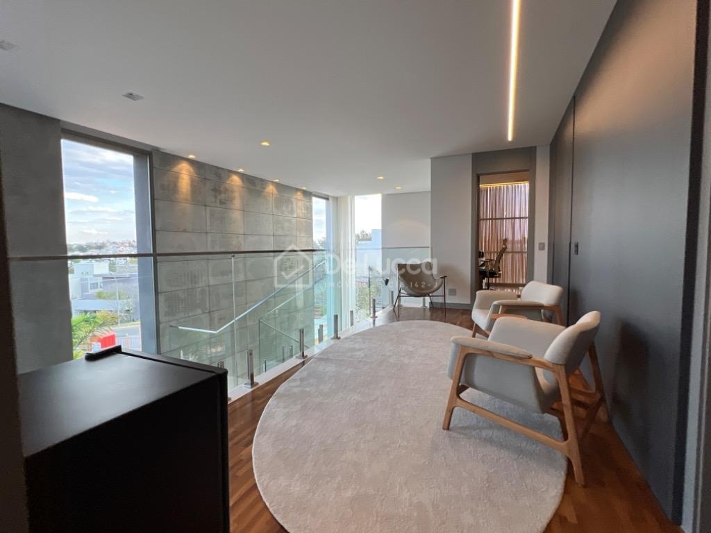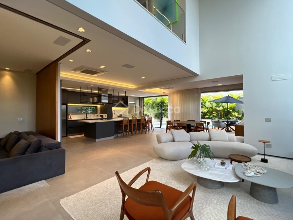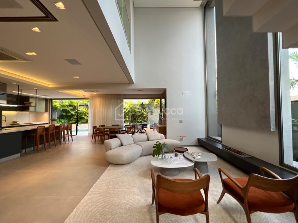 No pavimento inferior, você encontra um amplo living com pé direito duplo, integrado à cozinha moderna e ao espaço gourmet com churrasqueira. A piscina completa a área externa, proporcionando momentos de lazer e relaxamento. A casa ainda conta com home theater, lavabo e lavanderia, oferecendo total praticidade para o seu dia a dia.