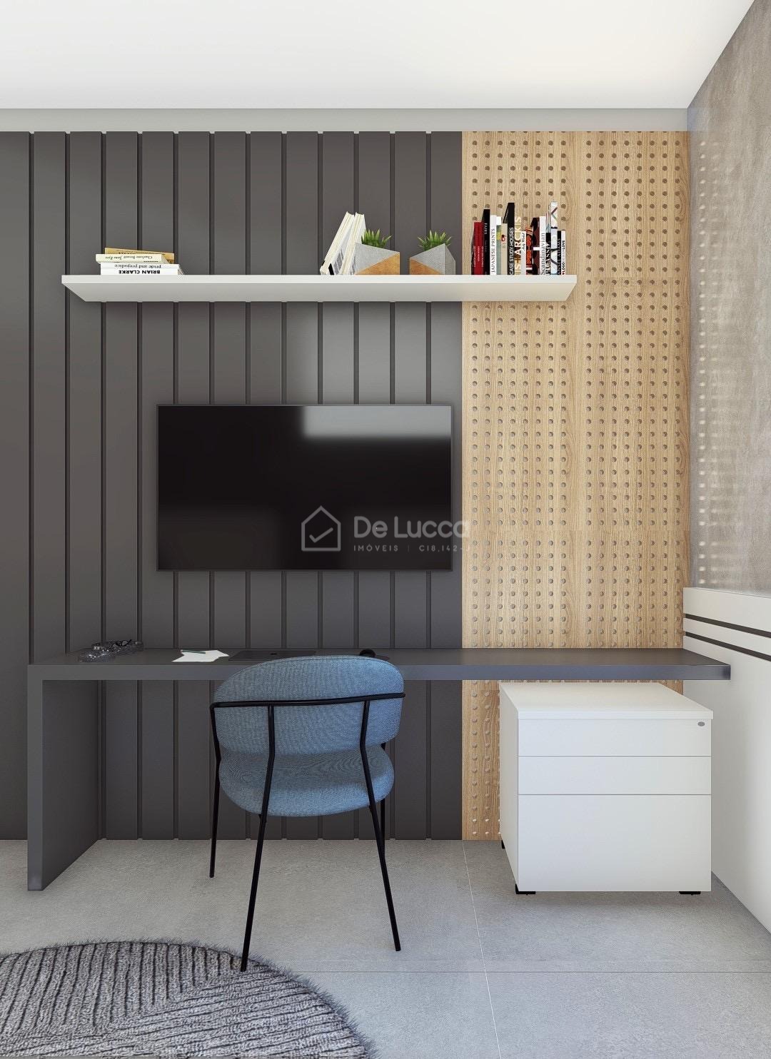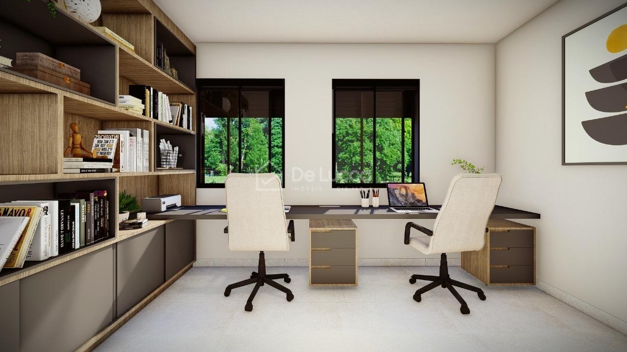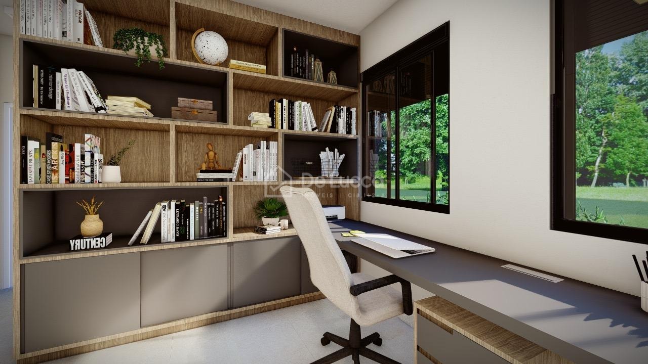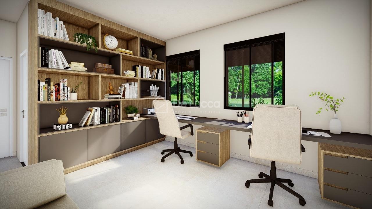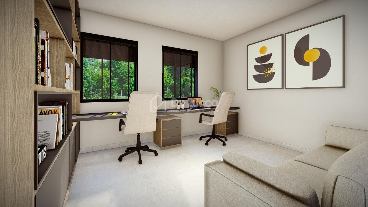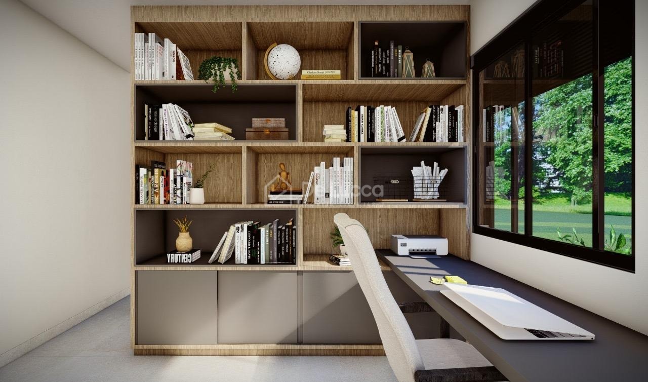 O imóvel também oferece um escritório funcional, ideal para home office ou estudos, com localização estratégica dentro da casa, equilibrando privacidade e integração com os demais espaços. Este ambiente pode ser facilmente adaptado às necessidades da rotina familiar, com espaço para prateleiras, móveis ergonômicos e boa iluminação.