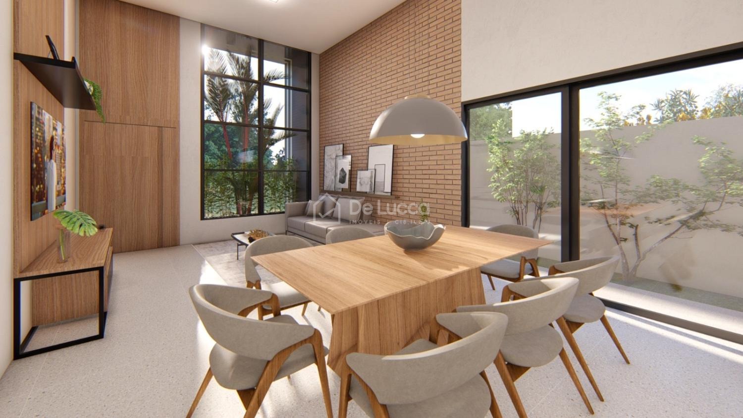 A sala principal impressiona com seus 5 metros de pé direito, criando uma atmosfera ampla e iluminada. Grandes janelas permitem abundante entrada de luz natural, conectando de forma harmoniosa os ambientes integrados, como sala de jantar e cozinha. O layout aberto favorece a convivência e torna os espaços ainda mais convidativos para receber amigos e familiares.