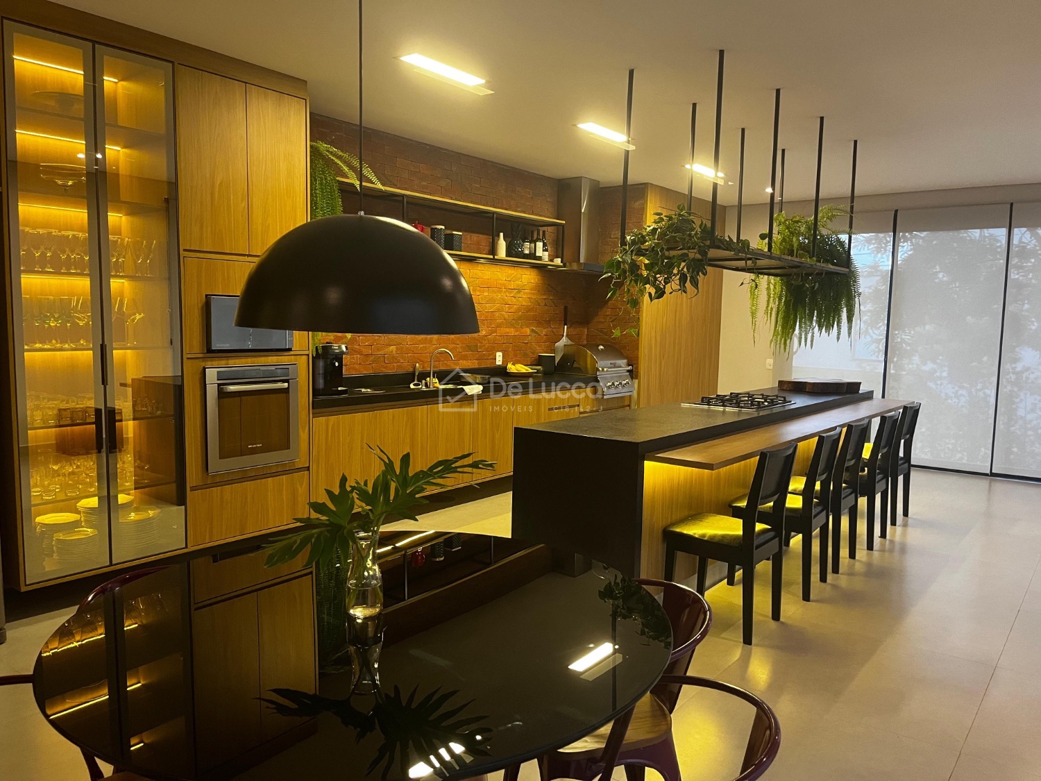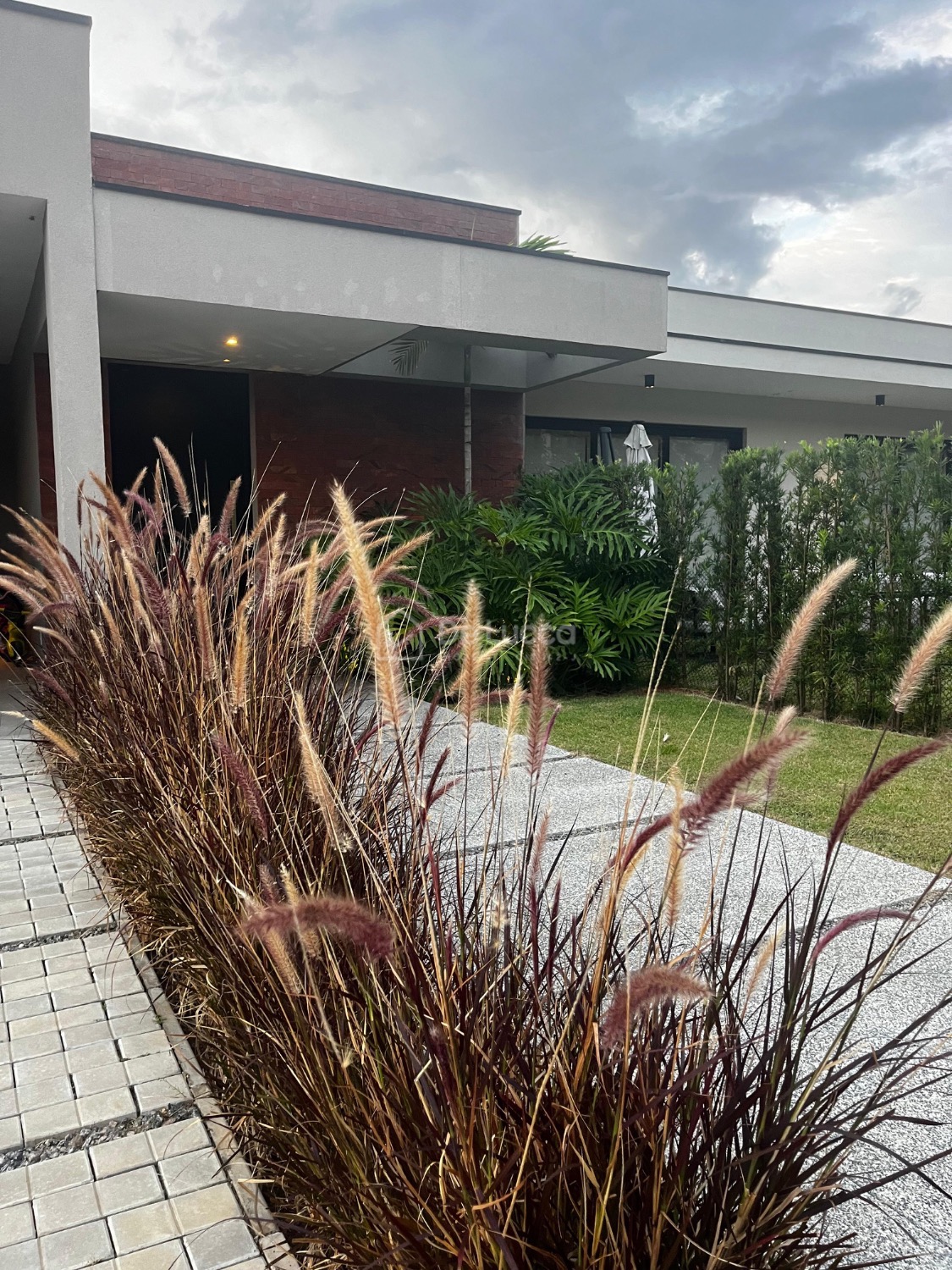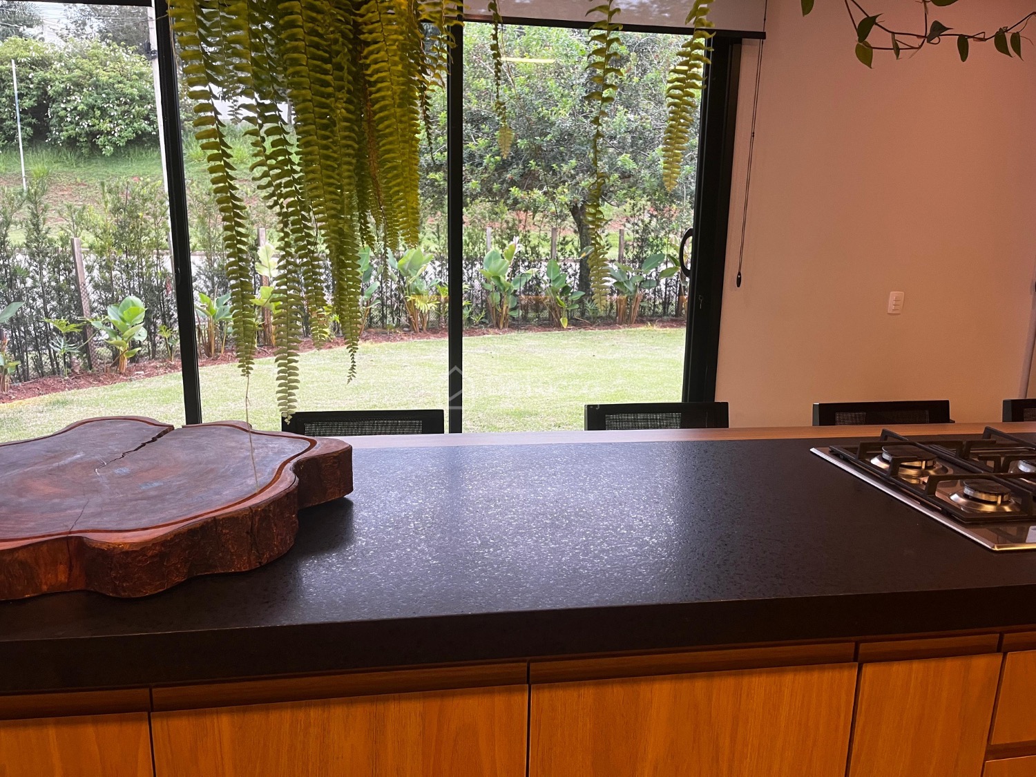 O jardim, assinado por uma bióloga, destaca-se por suas espécies cuidadosamente selecionadas, complementando a arquitetura e criando um ambiente natural e sofisticado.