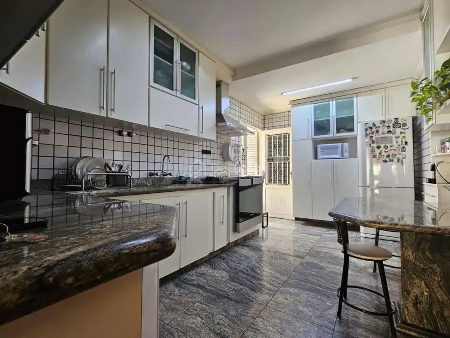 A área social é composta por uma cozinha planejada, despensa, área de serviço e dependências completas para funcionários, proporcionando praticidade para o dia a dia.