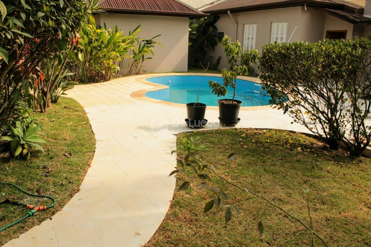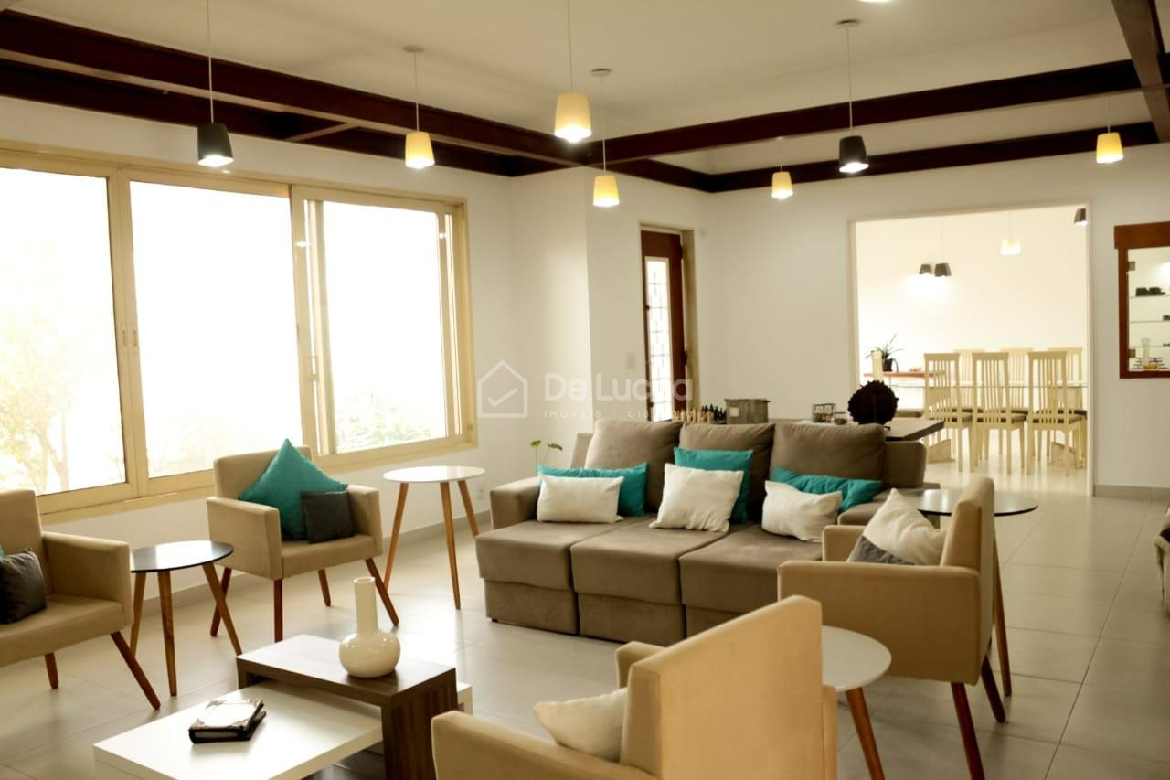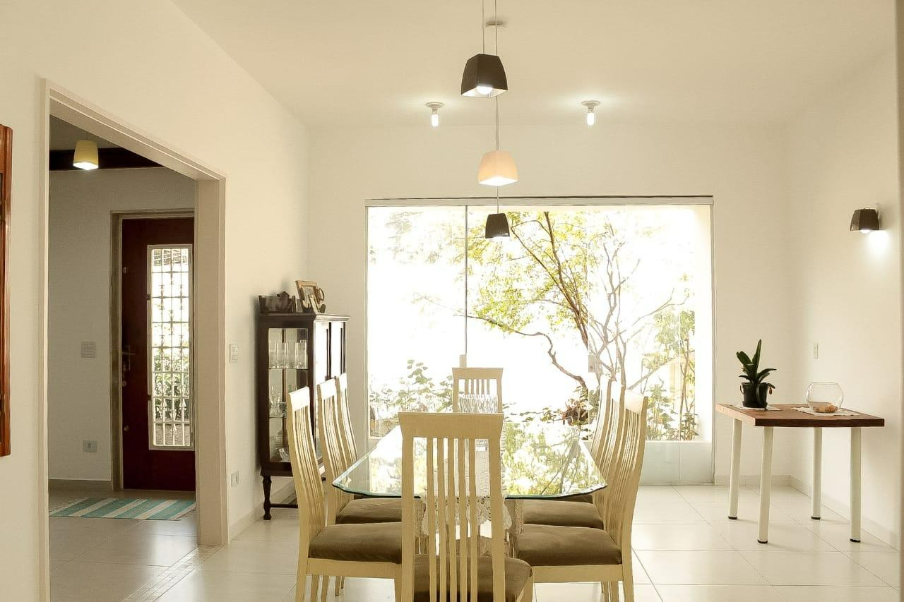 A casa principal, com aproximadamente 350 m² de área construída, conta com 4 suítes, salas amplas de estar e jantar, sala de almoço, cozinha planejada, lavabo e área de serviço. Todos os ambientes são muito ensolarados, proporcionando conforto térmico e excelente iluminação natural. O imóvel dispõe de jardim, quintal, piscina aquecida e 5 vagas de garagem.