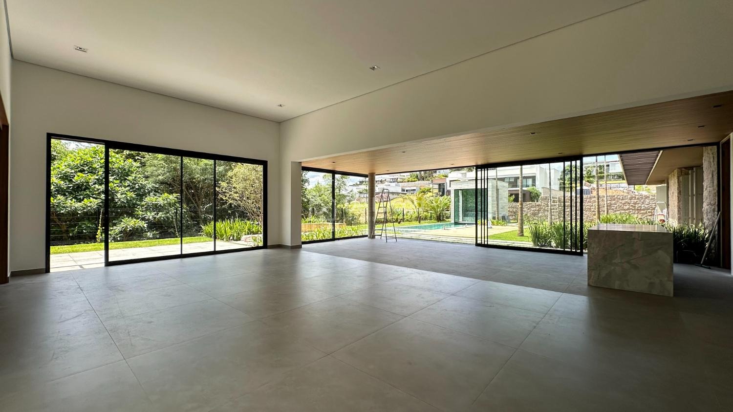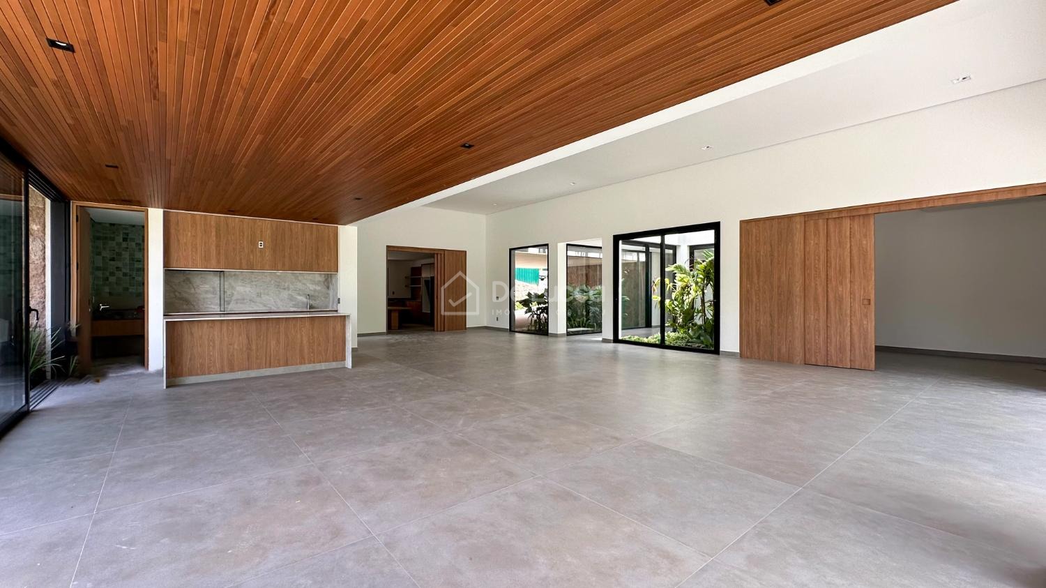 A cozinha, equipada com ilha central e despensa, combina funcionalidade e design, integrando-se perfeitamente ao living espaçoso e iluminado. Na área externa, o destaque vai para a piscina e o espaço gourmet com churrasqueira, criando o cenário ideal para momentos de lazer, convívio e contemplação.