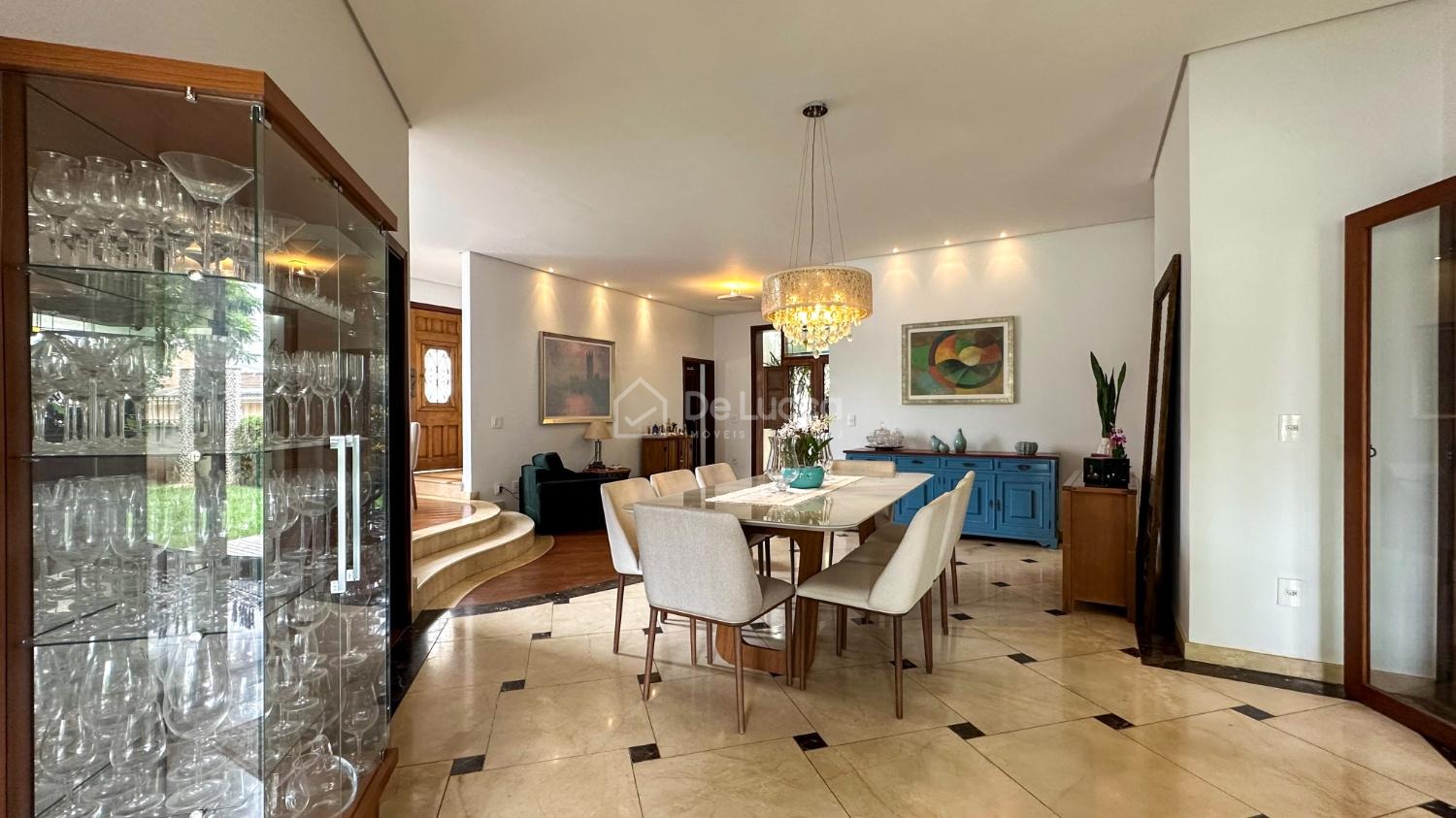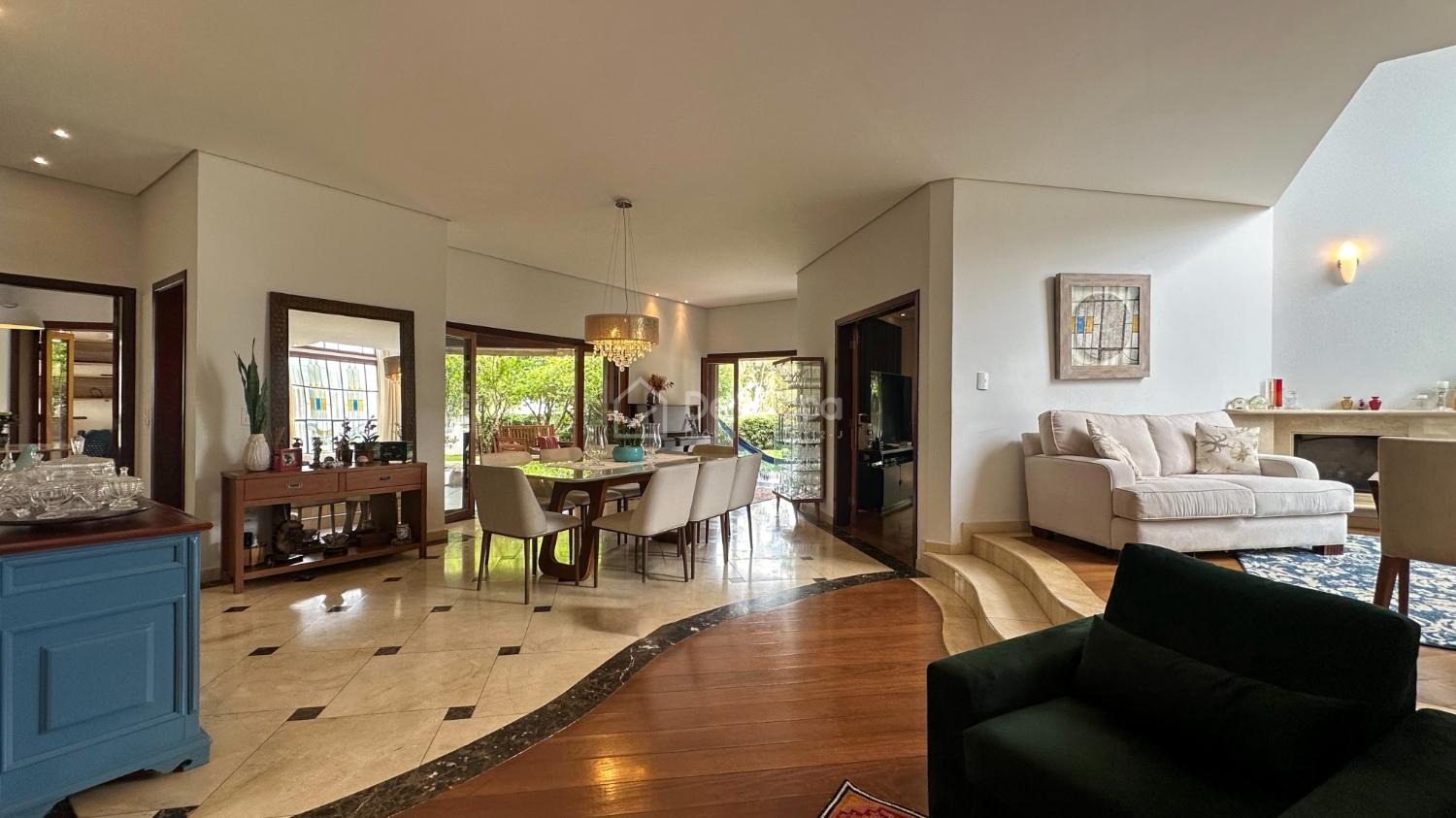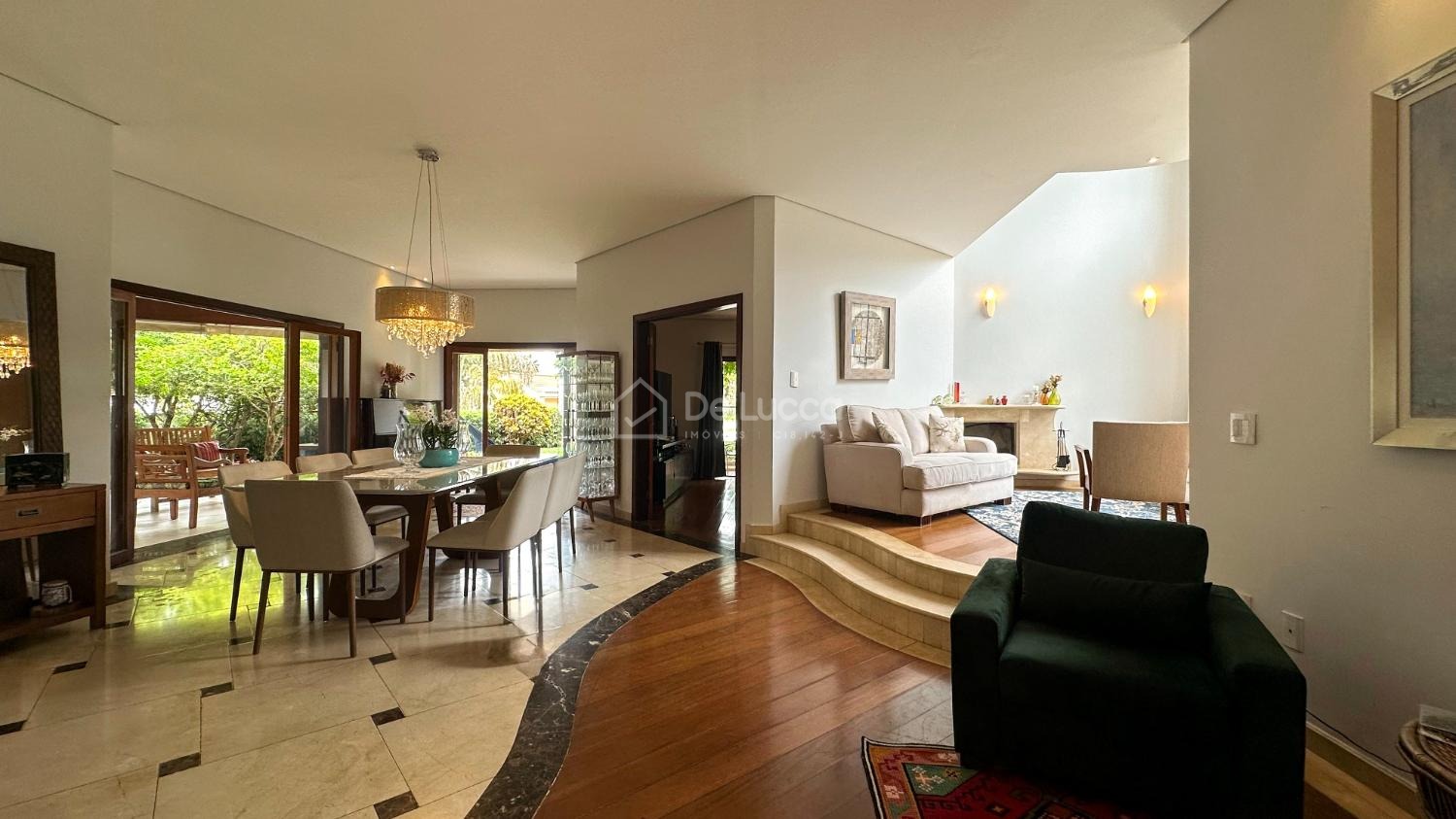No térreo, os ambientes sociais revelam amplitude e sofisticação: living para 3 ambientes com lareira e adega e sala de TV.