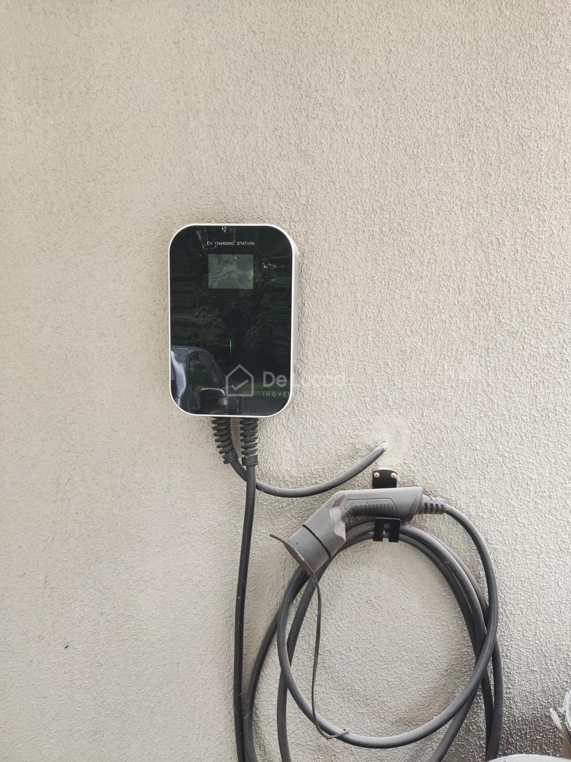 A garagem possui 3 vagas cobertas com carregador para carro elétrico, além de vagas descobertas.