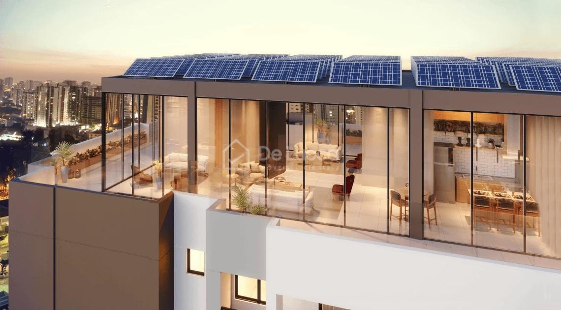 Destacam-se as comodidades exclusivas, como o Sky View no último andar com três Salões de Festas, Casa de Campo com piscina e churrasqueira, Delivery Room refrigerado, Espaço Uber, Lavanderia Compartilhada, Car Wash, Minimercado, e vagas com ponto de recarga para carro elétrico. O prédio contará com gerador de energia, infraestrutura para gôndolas e máquinas automatizadas, e uma Fazenda Solar no topo, além de uma Árvore Solar prevista, sujeita a autorização da Prefeitura.